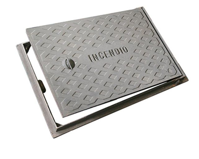 Tampa de ferro fundido 60×40 cm, com inscrição “Incêndio”, para registro de recalque. Recomendado apenas para passagem de pedestres.